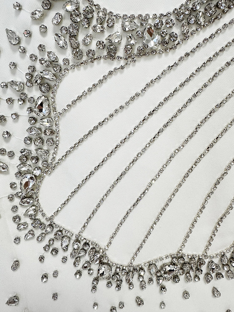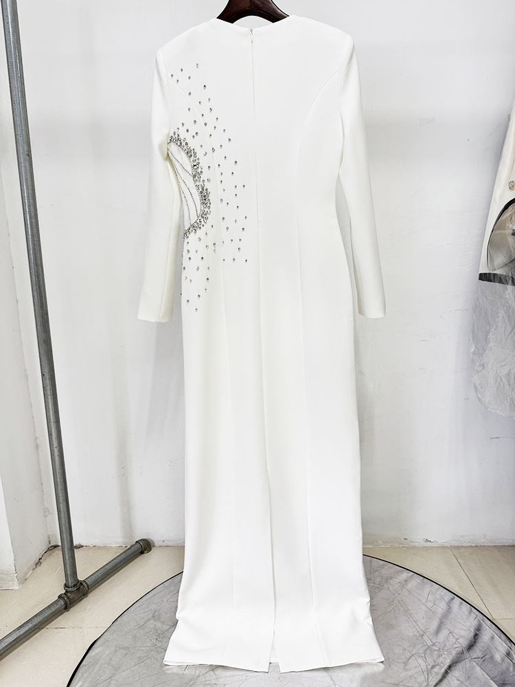 This refined white gown embodies modern elegance with its clean, structured design and floor-length silhouette. The long sleeves and high neckline provide sophistication, while the front is elevated by intricate silver embellishments and wave-like sculpted detailing that draw the eye to the bodice. Subtle crystal accents cascade delicately down the skirt, adding a touch of sparkle. The back features a smooth finish with a graceful slit for ease of movement, balancing modesty with allure. Perfect for formal galas, high-end soirées, or as a unique contemporary bridal option.