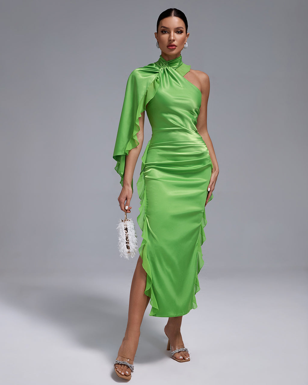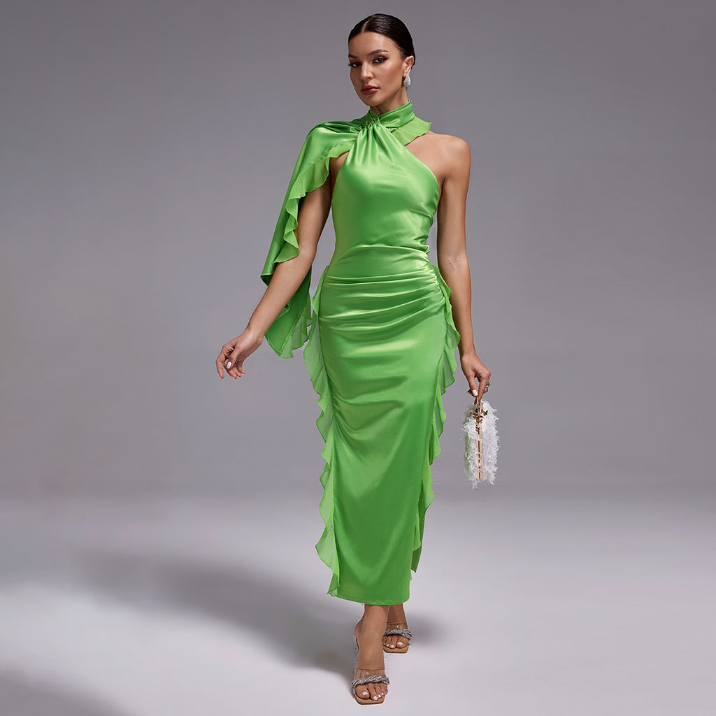 Shine with bold sophistication in this Green Satin One-Shoulder Midi Dress, designed to make a lasting impression. Crafted from lustrous satin, it features a high halter neckline that flows into an asymmetric one-shoulder silhouette, exuding contemporary glamour.